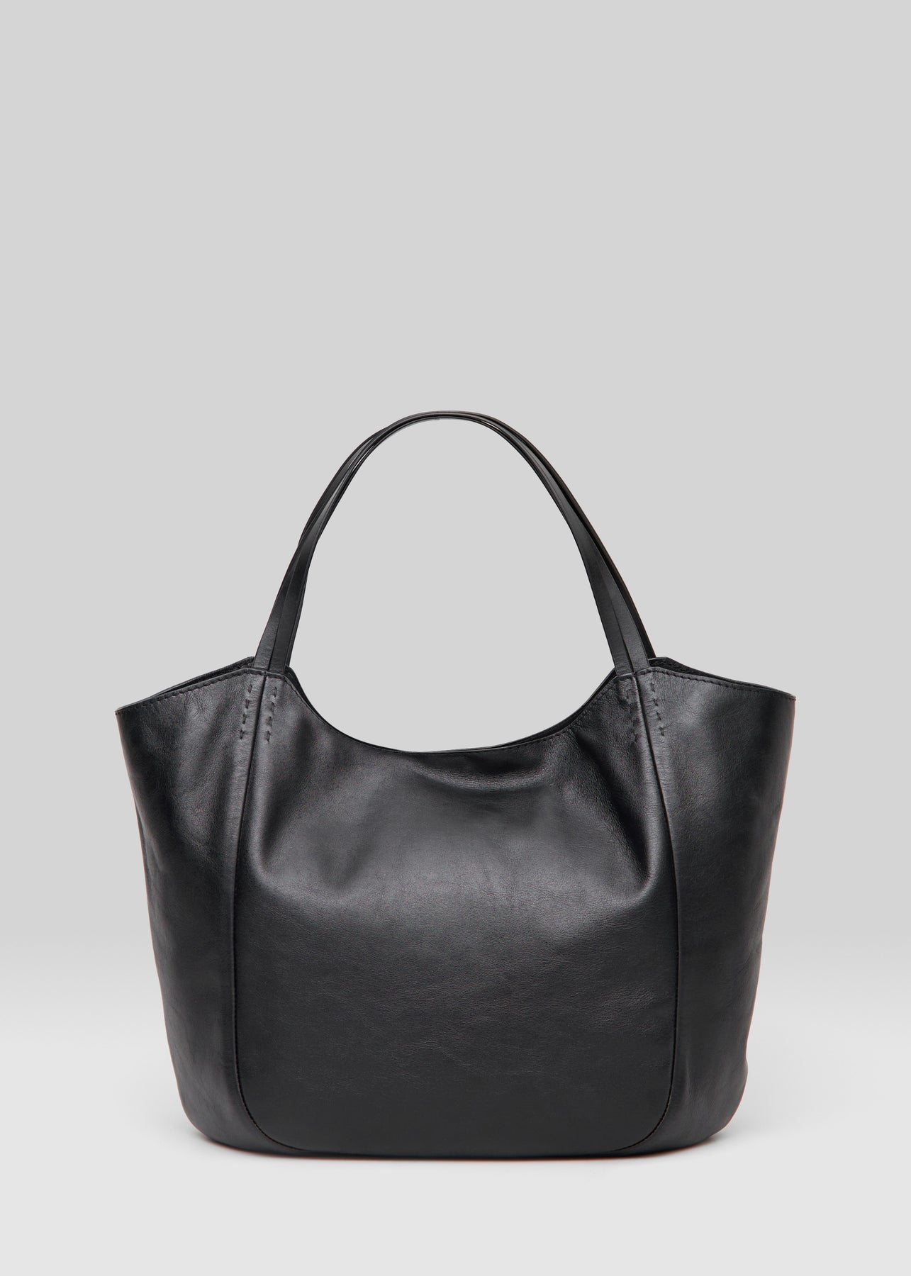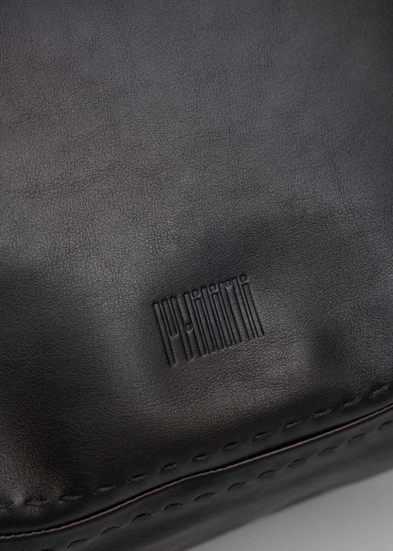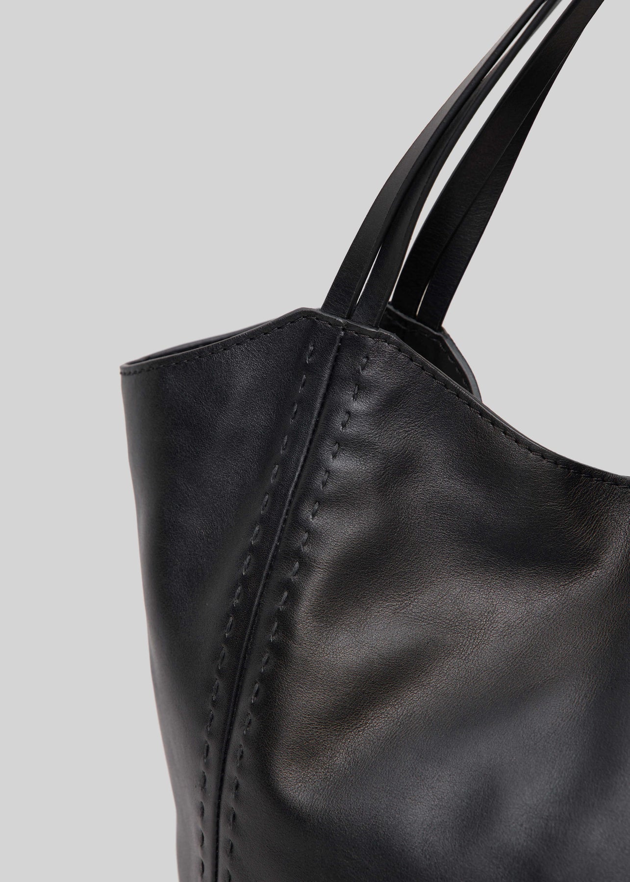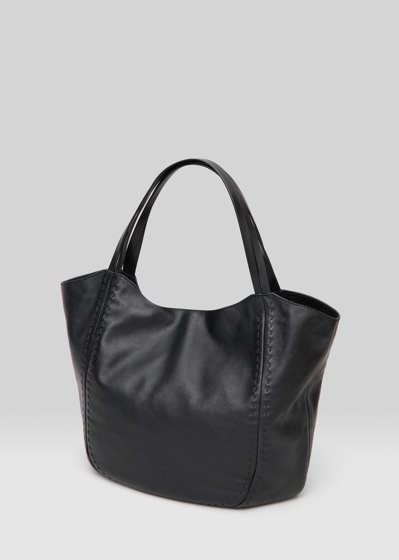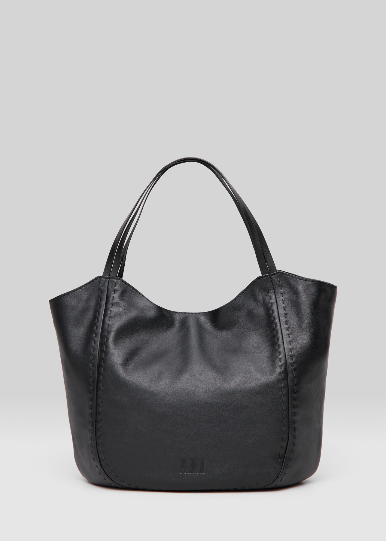 Close front view of the Philini Charlotte Tote Bag in black aniline calf leather, showing double flat handles and refined tonal stitching. Premium black leather tote, minimalist and durable